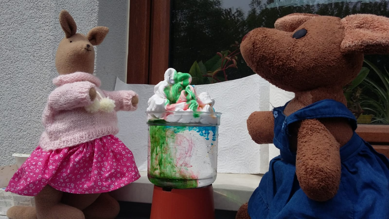 Nalewamy wody do naczynia i na wierch nakładamy piankę do golenia. Rozrabiamy kolorową wodę w nakrętkach, a następnie polewamy pianę. Obserwujemy efekty i robimy zdjęcia :)