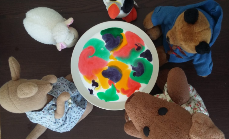 Na mleko wylewamy zabarwioną wodę. A następnie moczymy patyczek w płynie do mycia naczyń i dotykamy nim powierzchni mleka. Czekam na zdjęcia Waszych mlecznych obrazków :)