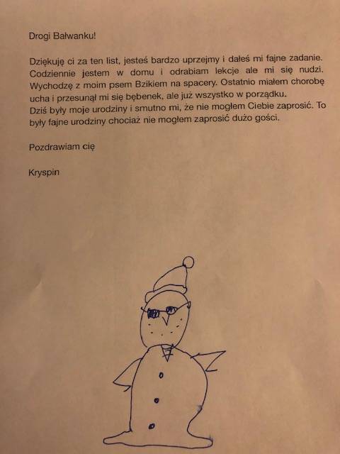 Możecie napisać go na kartce, możecie w programie Word, jako mail... forma dowolna. W listach napiszcie to, o co pytał bałwanek. Możecie też dodać coś od siebie, napisać to, co macie ochotę. Listy lub zdjęcia listów wyślijcie swojej wychowawczyni.