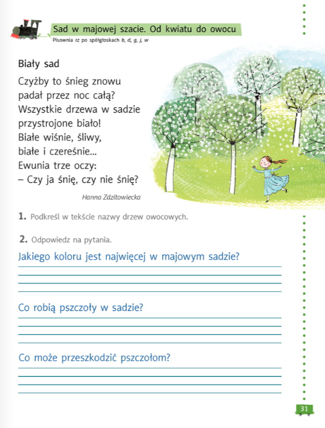 Zaglądamy do podręcznika na stronę 18. Czytamy wiersz i w zeszycie odpowiadamy na pytania, które są pod wierszem. Pamiętajcie o tym, by odpowiedzi pisać całym zdaniem.