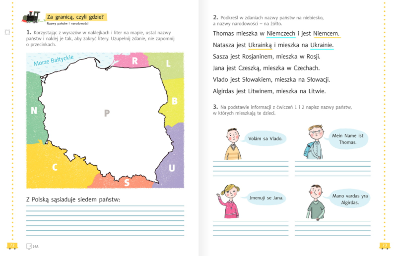 Ćwiczenia pomogą nam poznać lub przypomnieć sobie sąsiadów Polski. Uczymy się na pamięć nazw krajów sąsiadujących z Polską (nabytą umiejętnością chwalimy się rodzicom). W ćwiczeniach rozwiązujemy zadania ze stron 72-73.