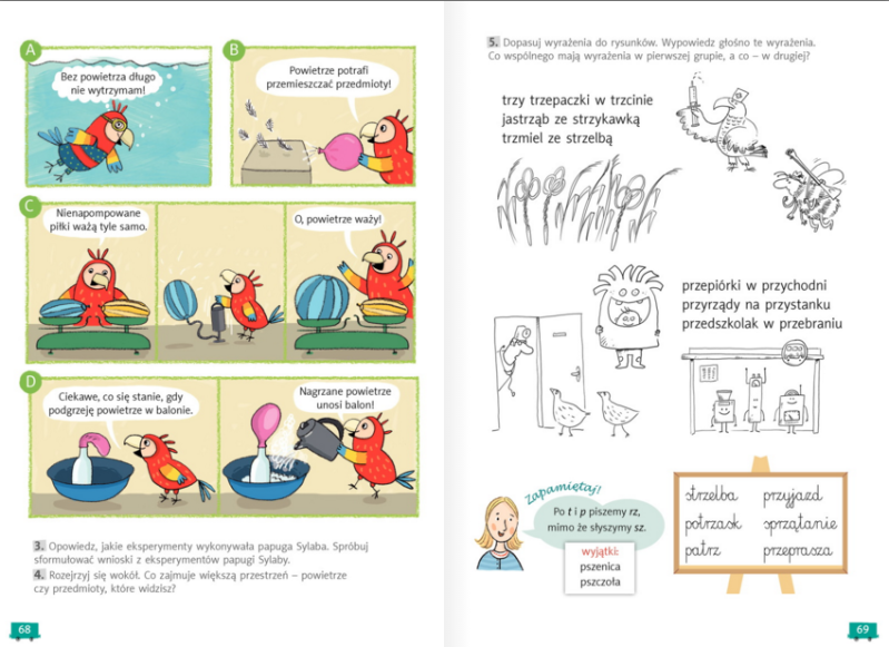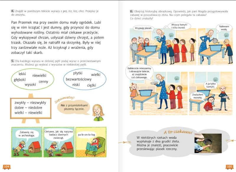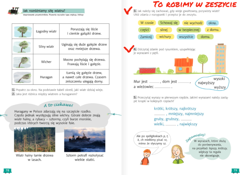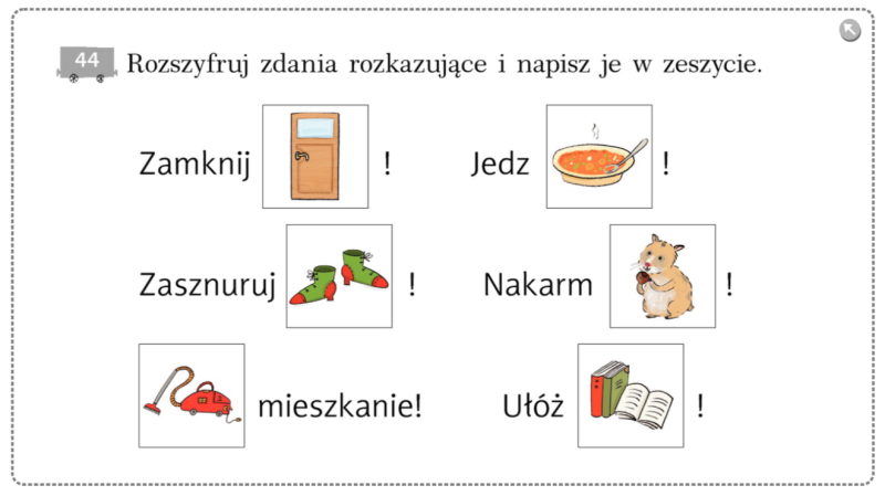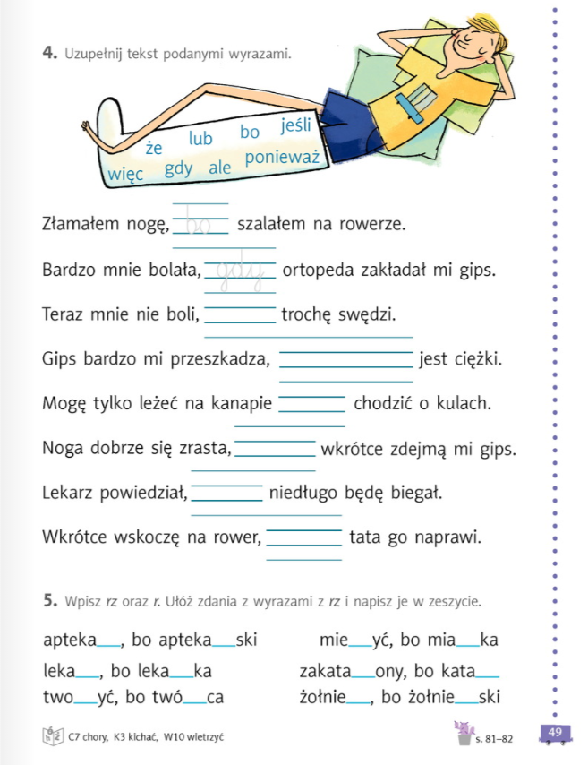 Teraz, kiedy już przeczytaliście komiks i obejrzeliście wszystkie obrazki zapraszam do ćwiczeń na stronę 49. W zadaniu 5, kiedy będziecie zapisywać zdania w zeszycie, postarajcie się w tych zdaniach użyć również wyrazów z zadania 4: że, lub, jeśli, ponieważ, więc, gdy, ale... Powodzenia!