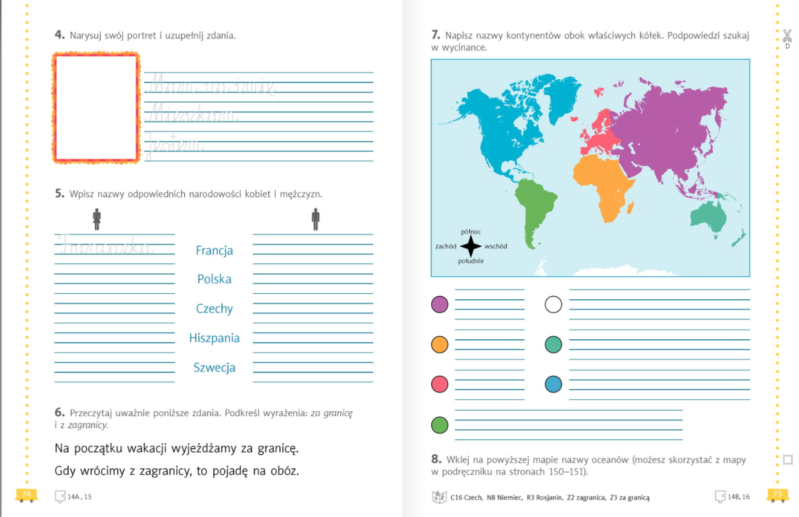 W ćwiczeniach robimy strony 74-75. W zadaniu 7 wpisujemy dodatkowo nazwy oceanów na mapie świata.