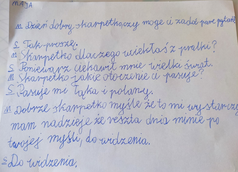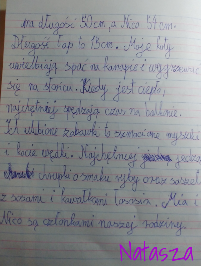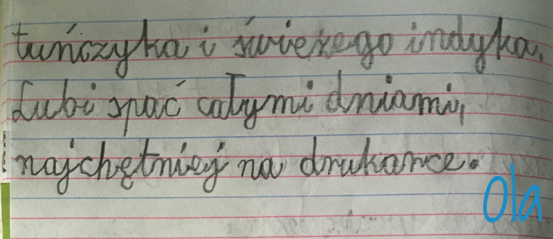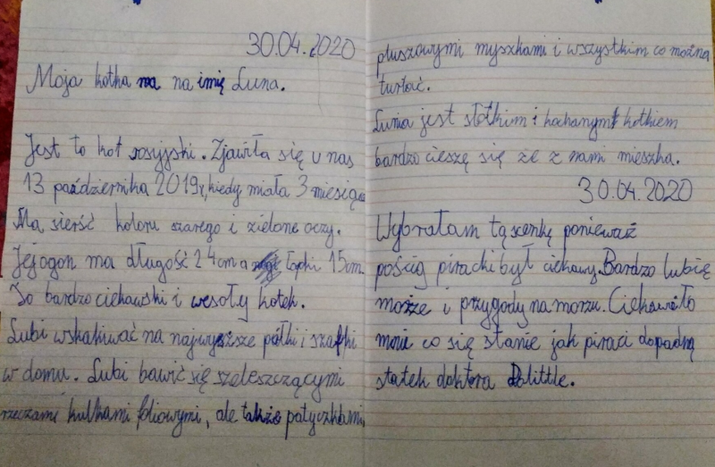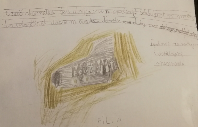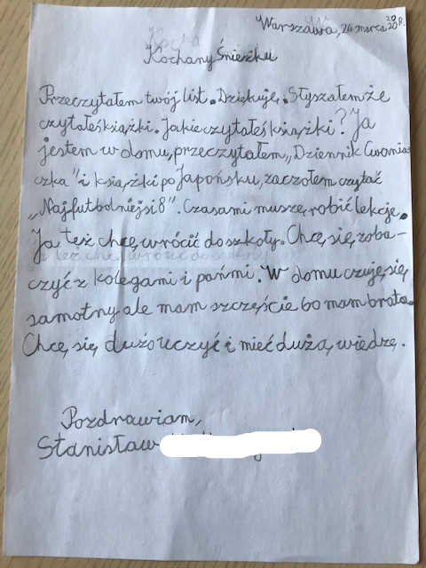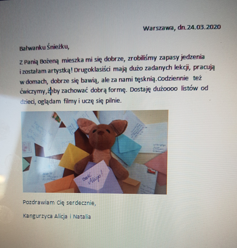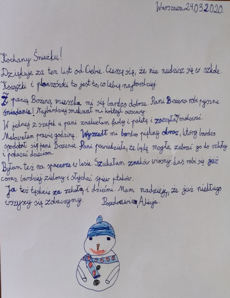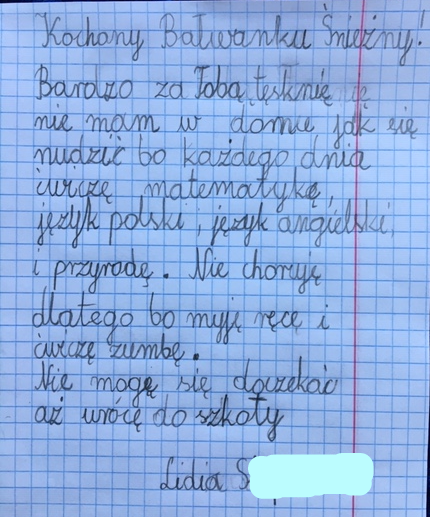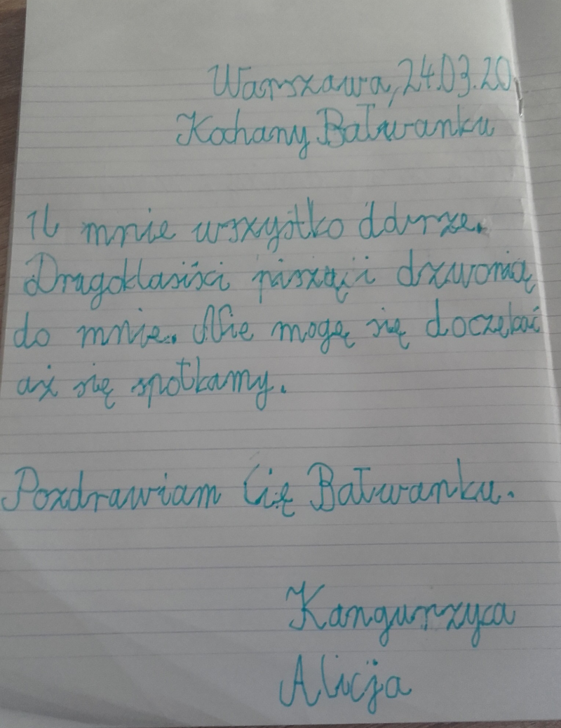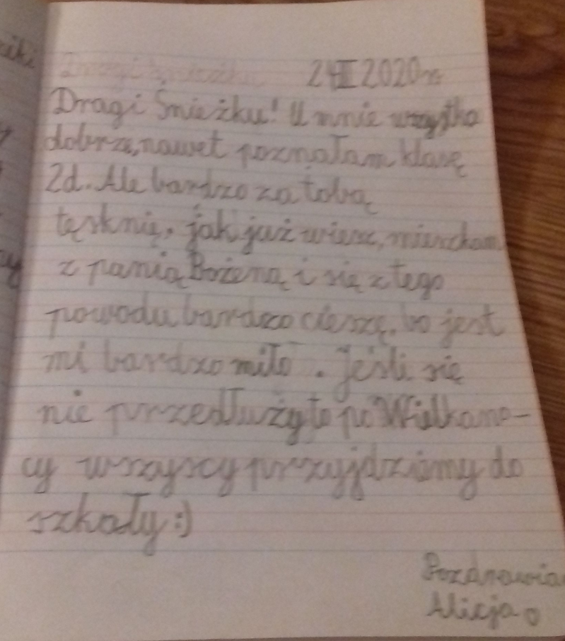 Codziennie odrabiam lekcje które zadała mi Alicja, wiesz że możemy z nią gadać na czacie? Tęsknie za szkołą a najbardziej za moimi kolegami. Pozdrawiam Cię bardzo i mam nadzieję, że się znów szybko spotkamy!