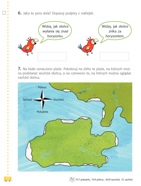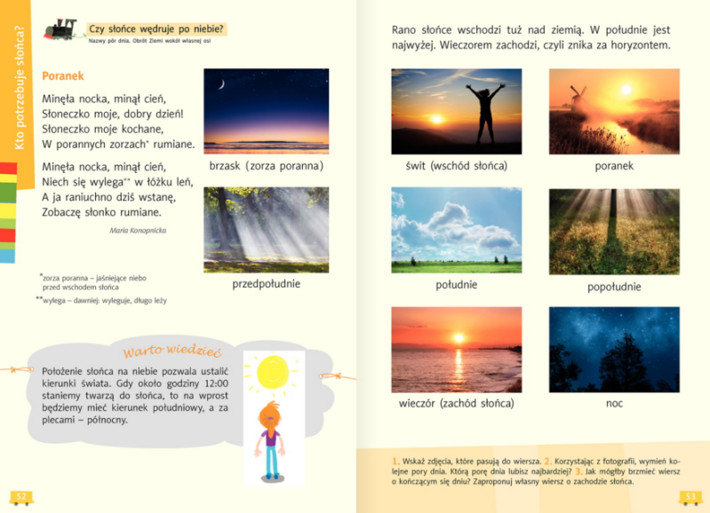 Wszyscy wiedzą, że Słońce to wielka gwiazda wokół której krążą różne planety, w tym i nasza Ziemia. Wiedzą... ale jak patrzą za okno to widzą zupełnie coś innego... Dzisiaj przyjrzymy się Słońcu, jego udawanym wędrówkom, porom dnia... Najpierw podręcznik. Zajrzyjcie na strony 52-55, obejrzyjcie obrazki i przeczytajcie, co tam jest napisane. Uwaga! Na dole strony 53 i na stronie 55 są zadania i pytania. NIE piszemy na nie odpowiedzi.