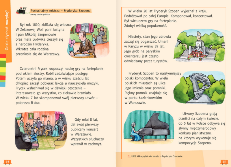 Przeczytajcie w podręczniku tekst o Fryderyku Chopinie - strony 14 -15. Chętni mogą też zajrzeć na dwie następne strony. Następnie w ćwiczeniach wykonaj zadanie 1 i 3 ze strony 16.