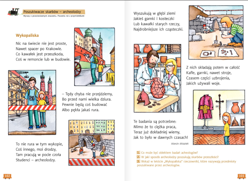 Wybieramy się dziś do muzeum. Zajrzyjcie do podręcznika, zobaczcie gdzie była klasa książkowej pani Magdy, a następnie odpowiedzcie w zeszycie do języka polskiego na pytania, które znajdują się pod obrazkami. Pamiętajcie o tym, żeby odpowiedzi pisać całymi zdaniami.