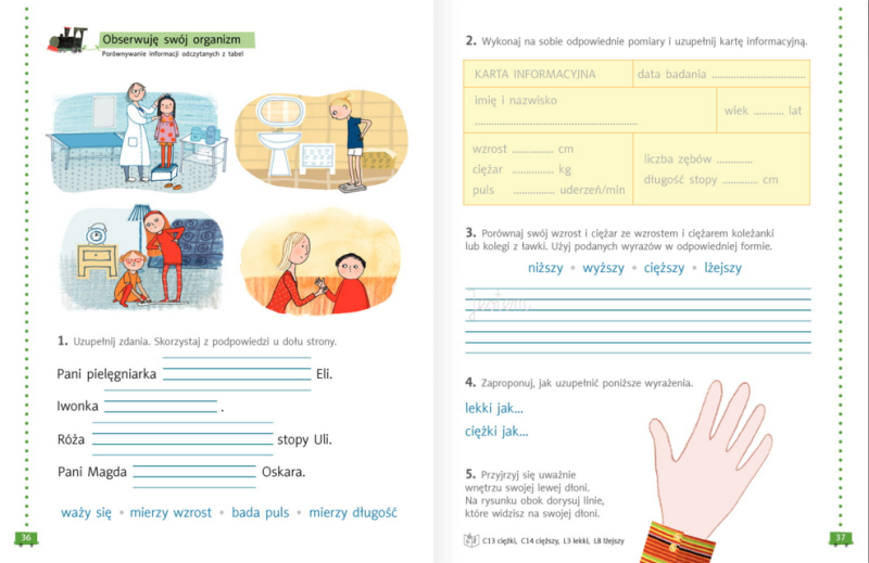 W ćwiczeniu 3 będzie Ci trudno porównać się z koleżankami i kolegami. Możesz zadzwonić do kilku osób i zapytać, jakie mają wyniki pomiarów. Możesz też porównać się z wybranymi zwierzętami. Sprawdź w internecie, ile ważą i jak wysokie są wybrane przez Ciebie zwierzęta i zapisz w ćwiczeniach odpowiednie zdania.