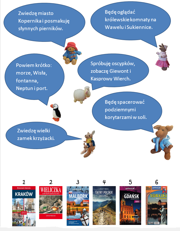 Dopasuj pluszakom odpowiednie przewodniki - tak by mogły dobrze przygotować się do wakacyjnych podróży. Zapisz w zeszycie do języka polskiego imię pluszaka i numer przewodnika.