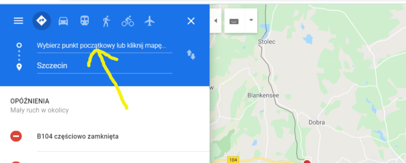 W miejscu pokazanym przez żółtą strzałkę wpisujemy miasto, z którego wyruszamy w trasę.