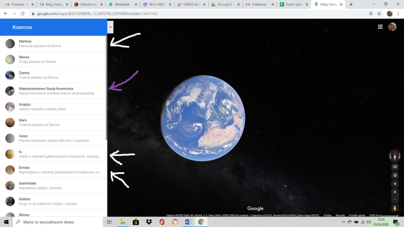 Jeśli klikniecie nazwy planet lub księżyców (białe strzałki) możecie zobaczyć z bliska np. Jowisza lub Marsa. Ciekawe, która planeta spodoba Wam się najbardziej?