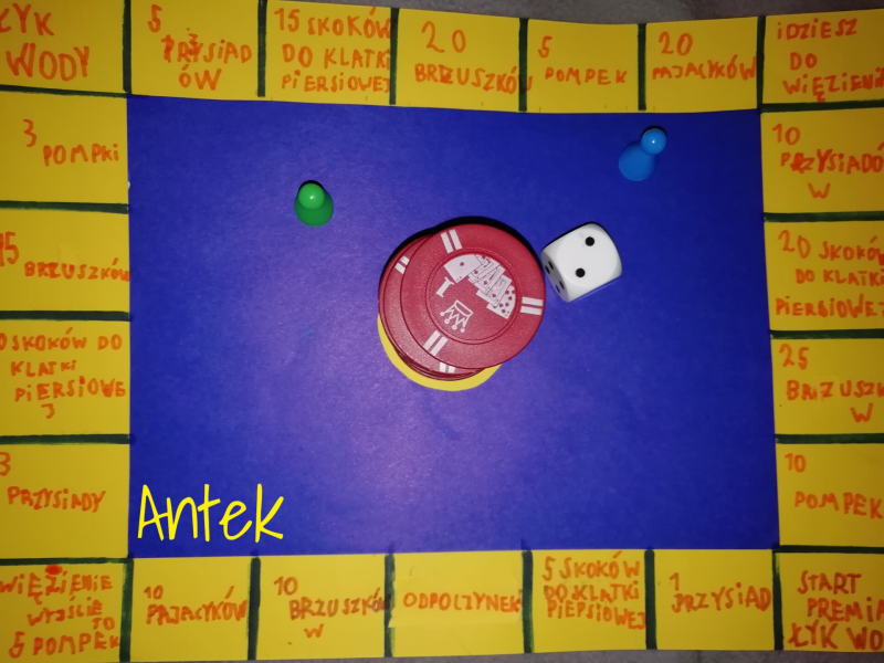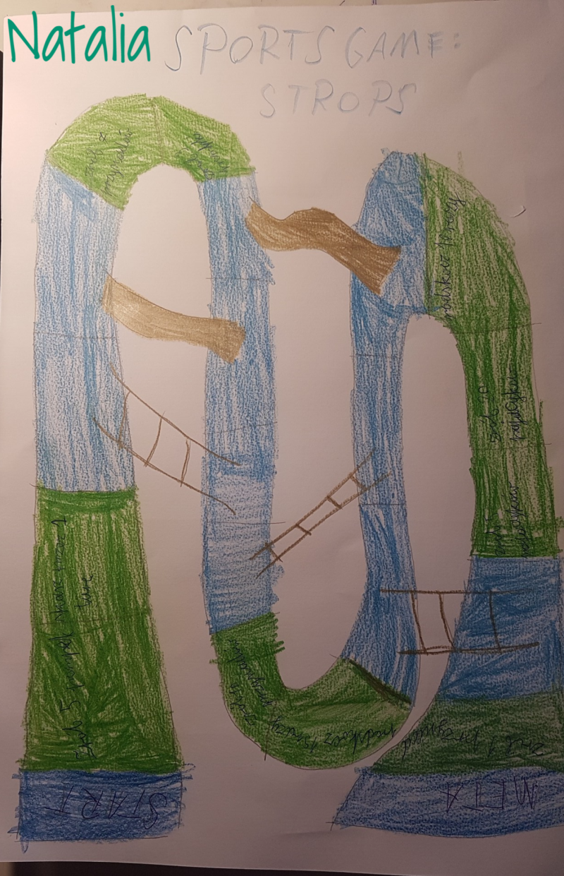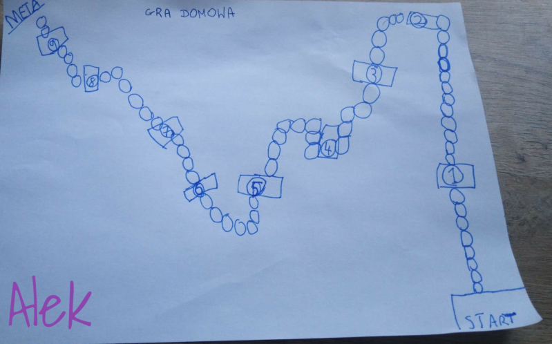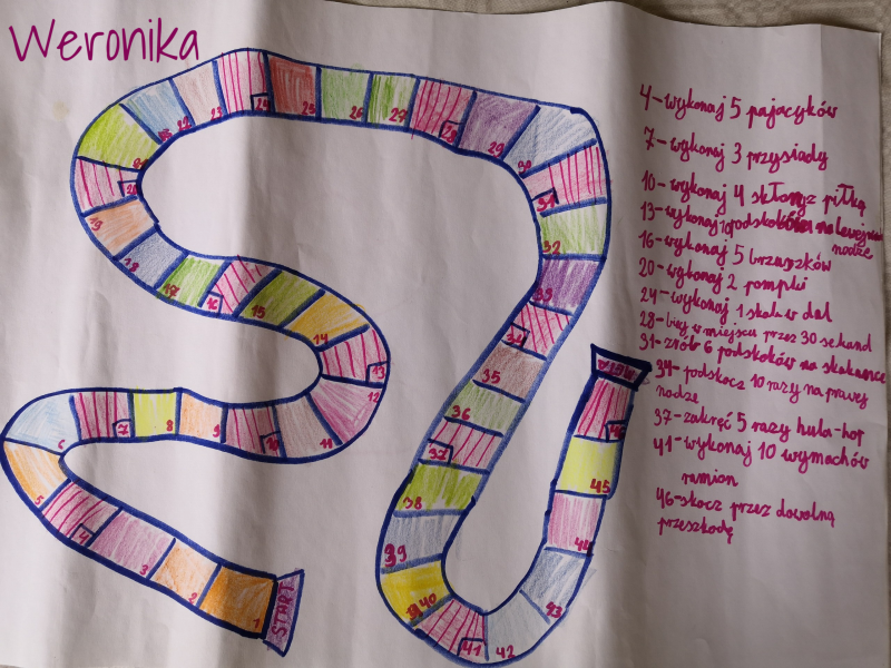 Dziś Waszym zadaniem jest wykonanie sportowej gry planszowej. Na kartce rysujemy trasę gry i zapisujemy sportowe zadania do wykonania. Zastanówcie się, czy to będzie gra domowa, czy gra do zabrania na piknik? Dopasujcie zadania do możliwości.
